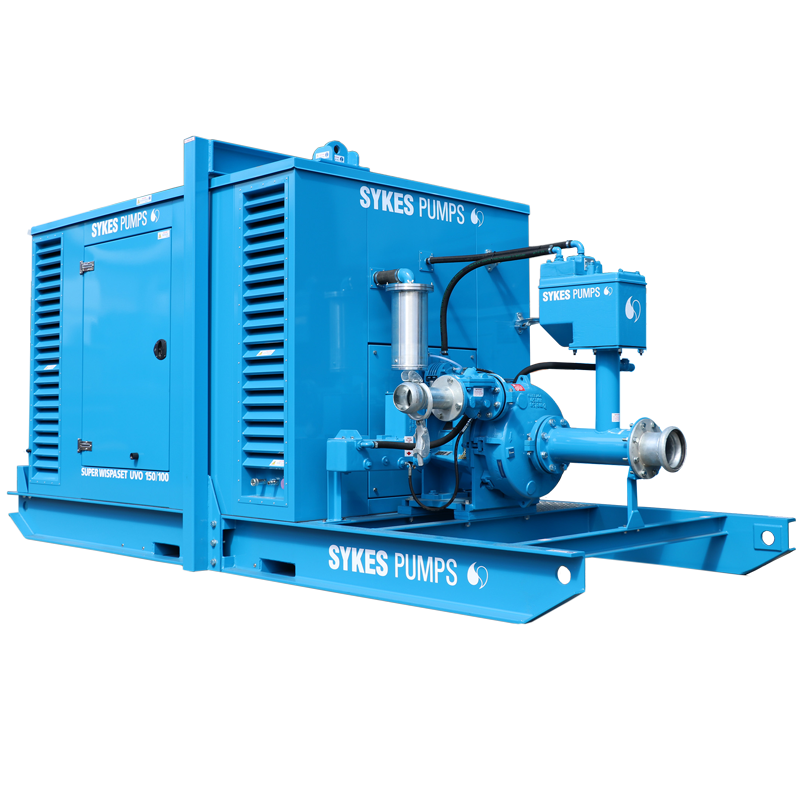 The Sykes Super Wispaset UVO 150/100 is a super silenced high-performance pump specifically designed for use on arduous, high head noise-sensitive applications. The pump runs on an innovative Tier 4-compliant Volvo TAD870VE engine which dramatically reduces emissions whilst meeting the latest European regulations. This market-leading product is contained within a sound-reducing canopy and has a maximum noise level of 70dBA at 7 metres. An average fuel consumption of just 16.8 litres an hour renders the Super Wispaset UVO 150/100 approximately 10% more efficient than comparable pumps on the market. The unit offers maximum heads of 93 metres and a maximum flow of up to 120 litres per second, while a built-in telemetry system provides detailed statistics about the pump’s performance.