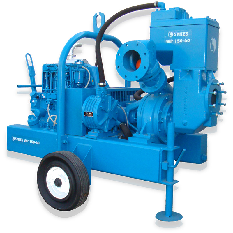 The WP150/60 is a specifically designed pumpset to handle clean or dirty water containing limited solids, used extensively on construction sites for dewatering, by oil companies, municipalities and utilities, and for marine and agricultural applications. The WP150/60 incorporates the unique Sykes Univac high flow automatic vacuum system. This enables the pump to prime and re-prime fully automatically, allowing for fast drawdown and excellent air handling characteristics enabling the pumpset to maintain constant vacuum when used on wellpoint systems..